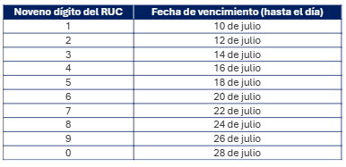 El ICT debe presentarse en julio del año siguiente al ejercicio fiscal auditado, conforme al noveno dígito del Registro Único de Contribuyentes (RUC), de acuerdo al siguiente calendario: