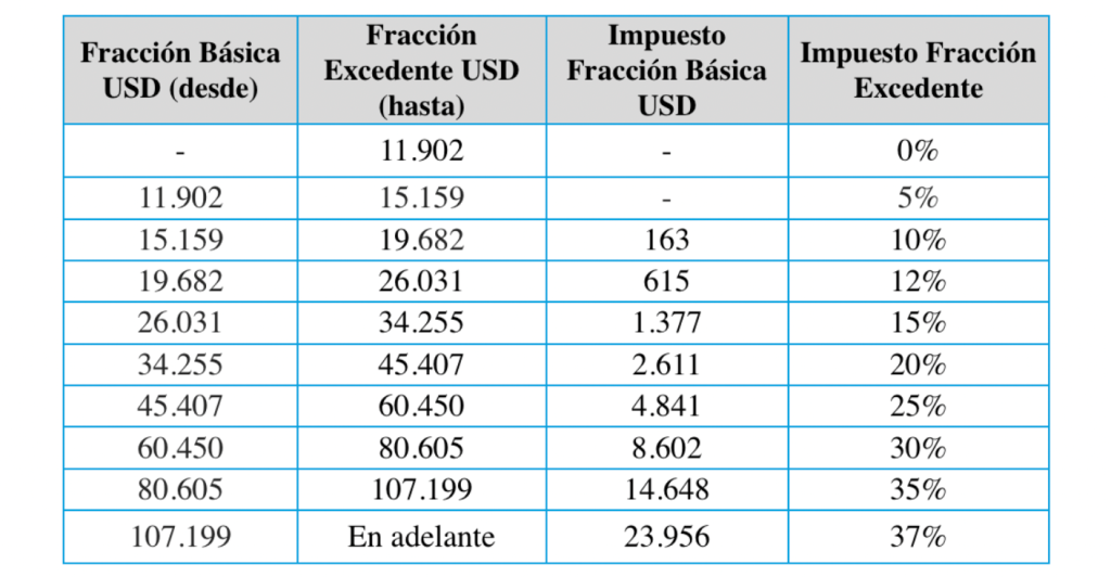 Sobre la base imponible así obtenida, se aplicará la tarifa contenida en la tabla de Impuesto a la Renta de personas naturales y sucesiones indivisas prevista en la Ley de Régimen Tributario Interno (LRTI) siendo esta aplicable para el ejercicio fiscal 2024 la siguiente:
