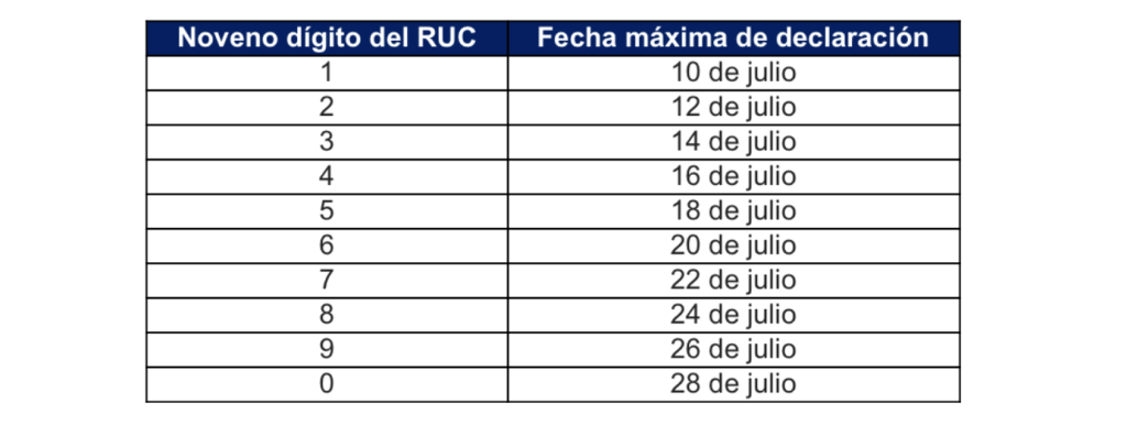 - Declaración y Pago del Impuesto a la Salida de Divisas en Exportaciones de Bienes y Servicios (ISD Presuntivo): En este mes, los sujetos pasivos del ISD que no retornen al país las divisas generadas en exportaciones de bienes y servicios, deberán declarar y pagar un ISD presuntivo de manera acumulativa anual mediante el Formulario 109, en el evento de que las divisas generadas en las exportaciones no retornen al país dentro de los seis (6) meses posteriores al arribo de la mercadería al puerto de destino o al inicio de la prestación del servicio. Los contribuyentes especiales deberán presentar esta declaración hasta el 11 de julio y los demás contribuyentes deberán presentarla de acuerdo con su noveno dígito del RUC.
