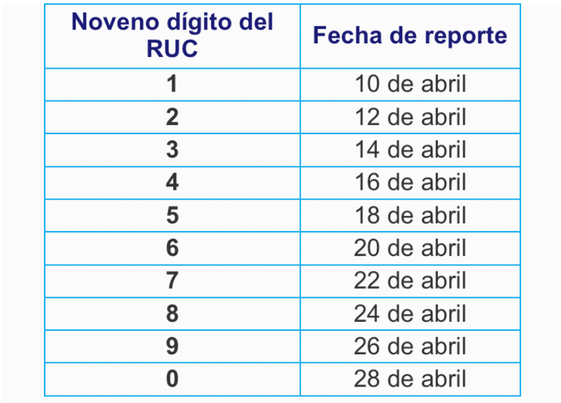- Declaración anual del impuesto a la renta para sociedades: Desde el 10 de abril hasta el 28 de abril del 2024, las empresas que no son contribuyentes especiales deben presentar la declaración anual del impuesto a la renta del ejercicio fiscal 2023, según el último dígito del Registro Único de Contribuyentes (RUC). Mientras que las sociedades catalogadas como contribuyentes especiales deberán presentar la declaración anual del impuesto a la renta correspondiente al ejercicio fiscal 2023 hasta el 11 de abril del 2024.