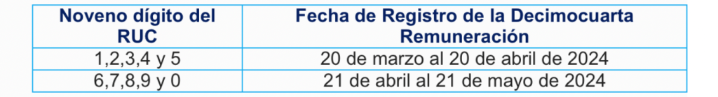 Registro del pago de la decimocuarta remuneración a trabajadores de la región Costa e Insular: Los empleadores deberán registrar el pago de la decimocuarta remuneración mediante el sistema de salarios en línea del Ministerio de Trabajo conforme al siguiente cronograma: