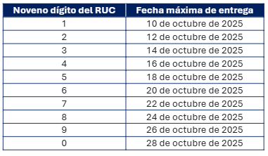 - Calendario tributario: Los contribuyentes especiales deberán presentar sus declaraciones tributarias hasta el 11 de septiembre del 2025. Si el día de la declaración vence en fin de semana o feriado, la declaración se podrá realizar el siguiente día hábil, siempre que se mantenga dentro del mismo mes, caso contrario la fecha de vencimiento deberá adelantarse al último día hábil del mes de vencimiento. El calendario tributario para las declaraciones de impuestos y anexos de este mes es como sigue: