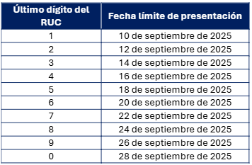 Según la disposición transitoria segunda incluida en la resolución, los contribuyentes obligados podrán presentar el Anexo y el Informe hasta el mes de septiembre de 2025, siguiendo las fechas de vencimiento previstas para las declaraciones mensuales de impuestos, según el último dígito del RUC de cada sujeto pasivo.