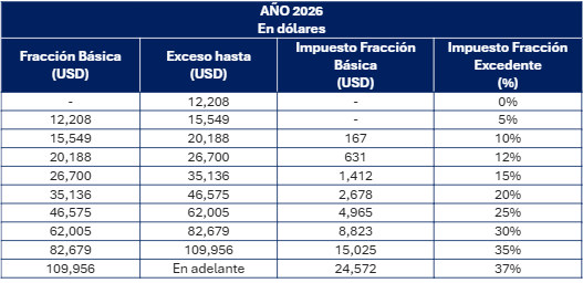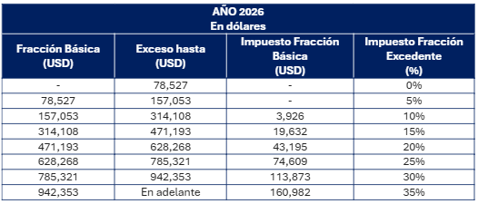 Para el ejercicio fiscal 2026, se establecen nuevos rangos de ingresos gravados para el cálculo del Impuesto a la Renta de personas naturales y sucesiones indivisas, de conformidad con la siguiente tabla: